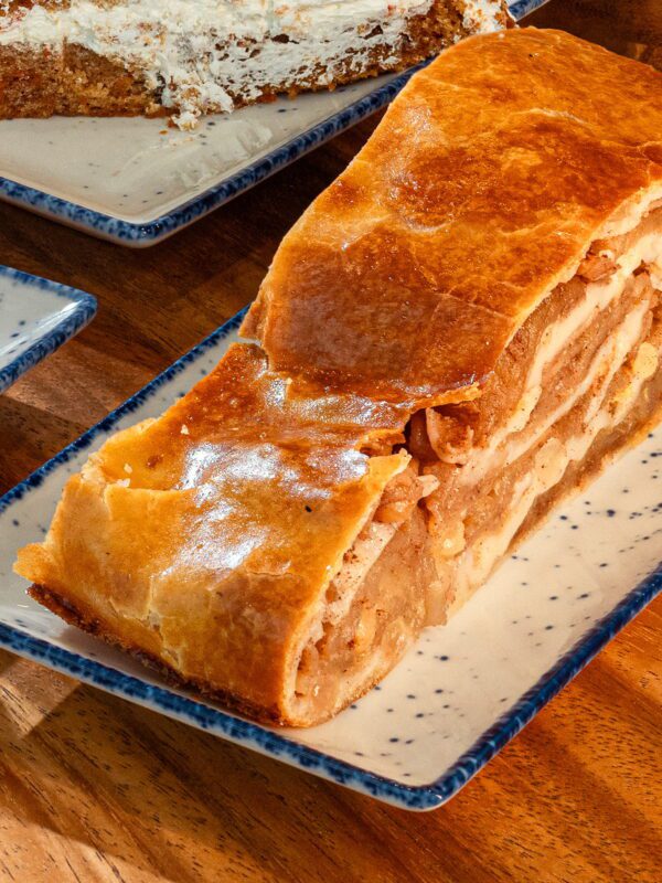 Apfelstrudel – mehr sog i ned! Our Bavarian-style German Apple Strudel is a celebration of the harvest season. Each slice is handcrafted using ultra-thin, sheeted strudel dough, carefully wrapped around a generous filling of sliced apples, sweet raisins, and crunchy almond sticks. Baked until golden and aromatic, it’s the perfect balance of crisp pastry and tender fruit.